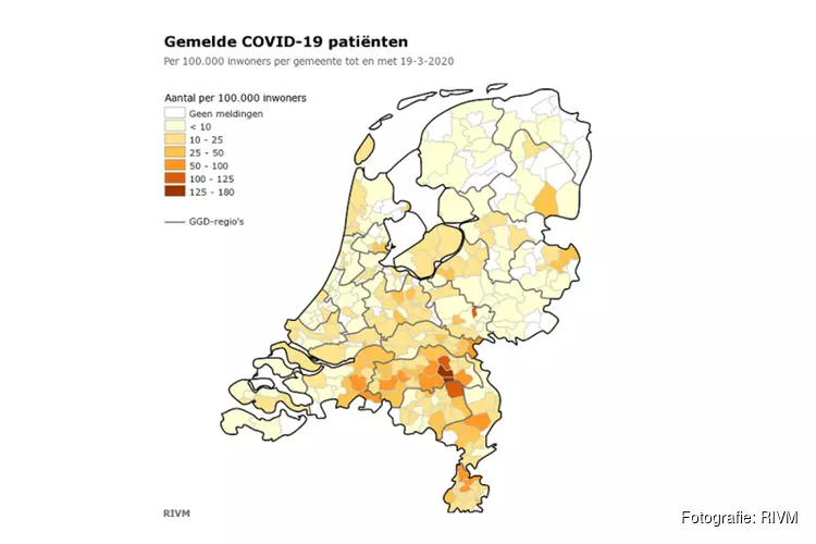 Sinds dinsdag wordt de verspreiding van het aantal positief geteste mensen in Nederland weergegeven met een incidentiekaart. De gekleurde vlakken geven niet het totale aantal positief geteste mensen weer, maar het aantal per 100.000 inwoners.