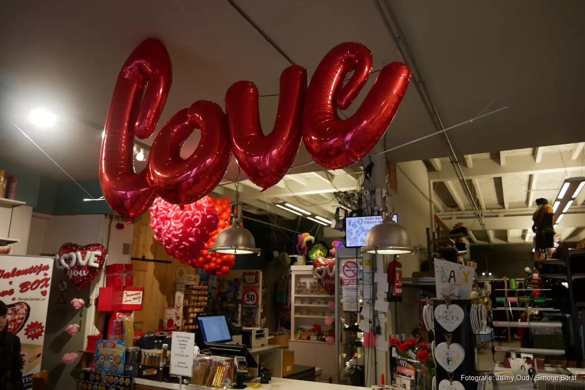 De winkel staat in de periode tot en met Valentijn helemaal in het teken van liefde en is versierd met roze ballonnen en knuffels.