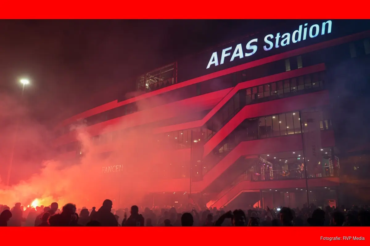 ALKMAAR - Duizenden AZ-supporters hebben zondagavond bij het AFAS-Stadion de spelersbus van AZ opgewacht na de winst van de KNVB-beker eerder die avond. AZ won de finale in De Kuip te Rotterdam door NEC met 5-1 te verslaan. Zondagavond laat kwam de spelersbus terug bij het eigen stadion waar een flinke menigte stond te wchten om nog een klein feestje te vieren.