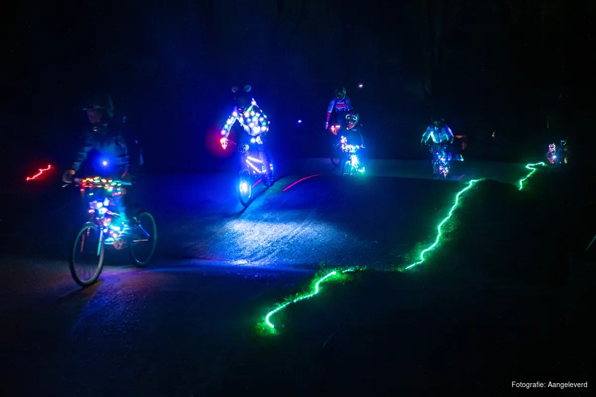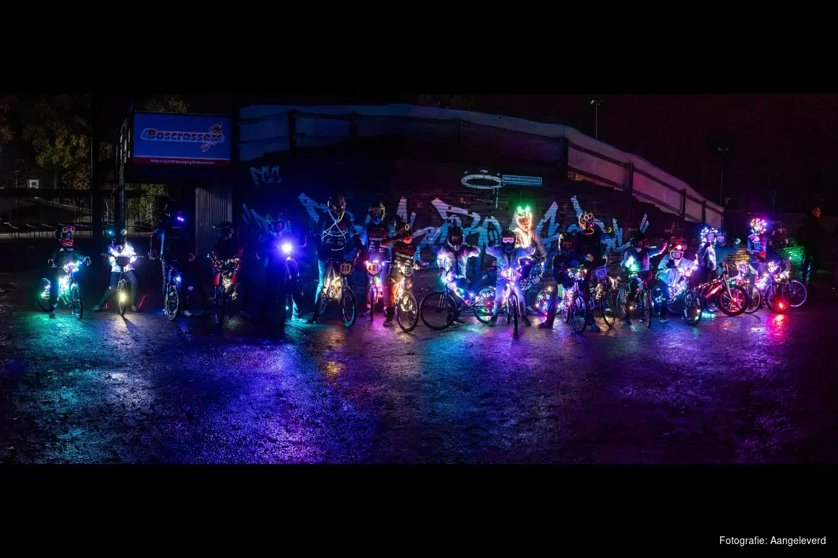 HEILOO - Afgelopen vrijdag vond de derde editie van lichtjesavond plaats bij BMX Vereniging de Boscrossers. Meer dan vijftig leden verschenen met kleurrijk verlichte fietsen aan de start en reden in volledige duisternis over de baan. De lichtmasten stonden bewust uit om aandacht te vragen voor een probleem dat de vereniging al jaren bezighoudt: de sterk verouderde verlichting van het BMX-parcours.